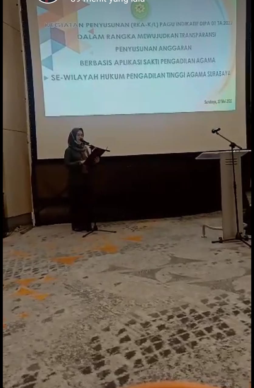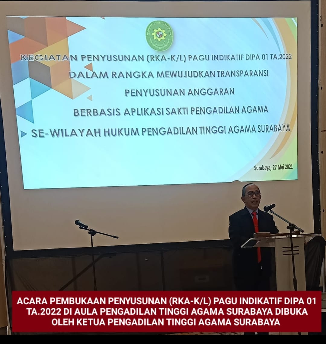 Acara Pembukaan Penyusunan (RKA-K/L) Pagu Indikatif DIPA 01 TA.2022 dibuka oleh Ketua Pengadilan Agama Tinggi Surabaya Drs. H. Mohammad. Yamin Awie, S.H., M.H. Kegiatan Penyusunan (RKA-K/L) Pagu Indikatof DIPA 01 Tahun Anggaran 2022 dalam Rangka mewujudkan Transparansi Penyusunan Anggaran Berbasis Aplikasi Sakti Pengadilan Agama Se Wilayah Hukum Pengadilan Tinggi Agama Surabaya.