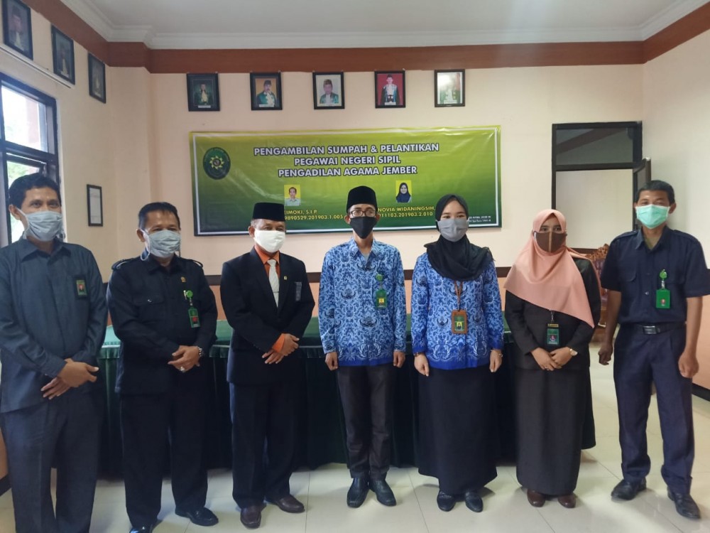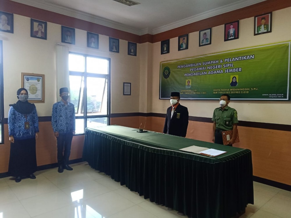 Pada hari Kamis 09 April 2020, pukul 13.30 WIB dilaksanakan Pengambilan Sumpah dan Pelantikan PNS PA. Jember di Ruang Sidang Utama PA. Jember. Pengambilan sumpah PNS diawali dengan menyanyikan lagu kebangsaan Indonesia Raya dan dilanjutkan dengan Hymne Mahkamah Agung Republik Indonesia.