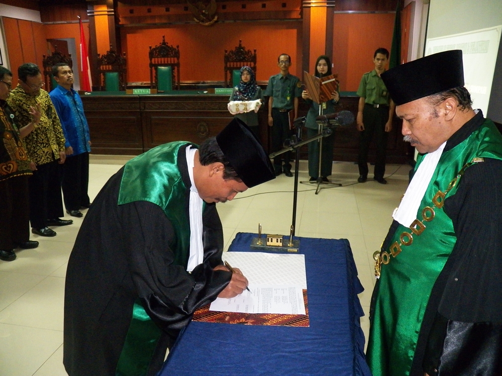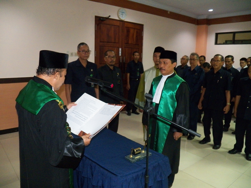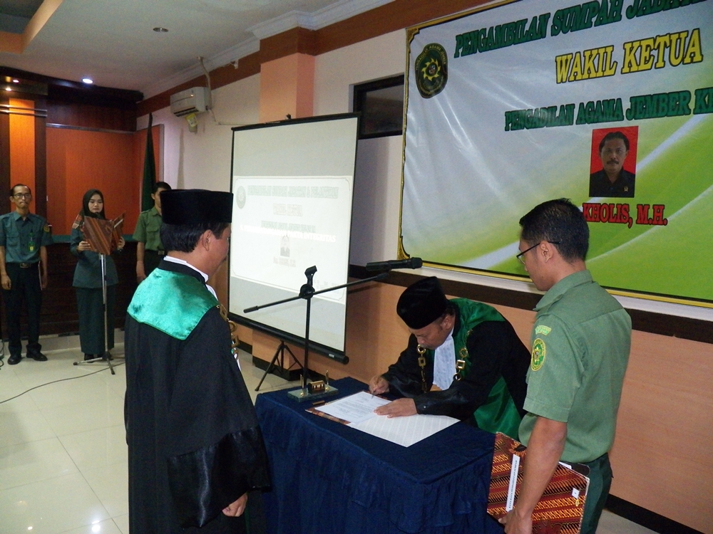 Suasana penuh Khidmat ini diawali dengan Pembacaan SK dan dilanjutkan berturut-turut dengan acara upacara pengambilan sumpah jabatan dan pelantikan yang langsung diambil sumpahnya oleh Ketua Pengadilan Agama Jember sendiri (Drs.H. Moh. Khazin, M.H.E.S.). Setelah itu dilanjutkan dengan Upacara Pelantikan Wakil Ketua juga penandatanganan Pakta Intergritas oleh Pejabat baru yang telah dilantik.