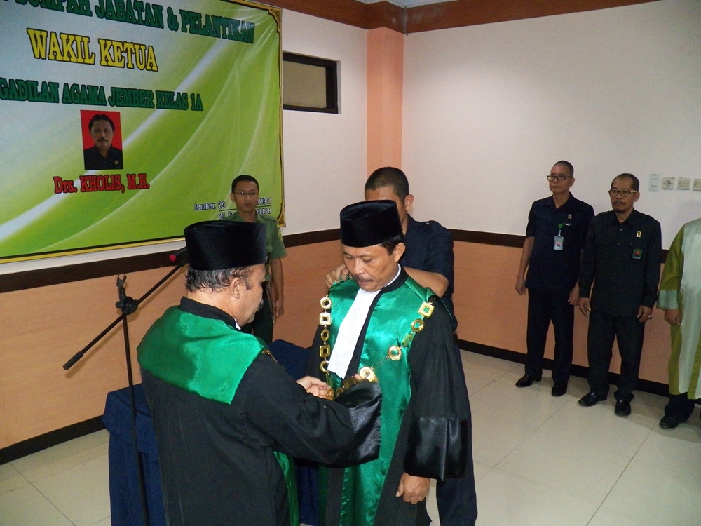 Bapak Drs. Kholis, M.H. telah resmi dilantik menjadi Wakil Ketua PA Jember yang baru, sebelumnya menjabat Ketua PA Sukoharjo. Acara dimulai Pukul 08.15 WIB, tepat diruang Sidang Utama PA Jember dan dihadiri oleh tamu dan juga dari seluruh Pegawai PA Jember.