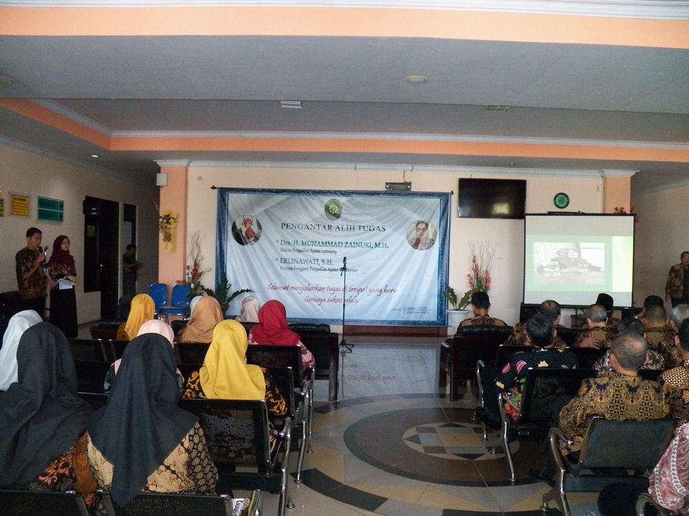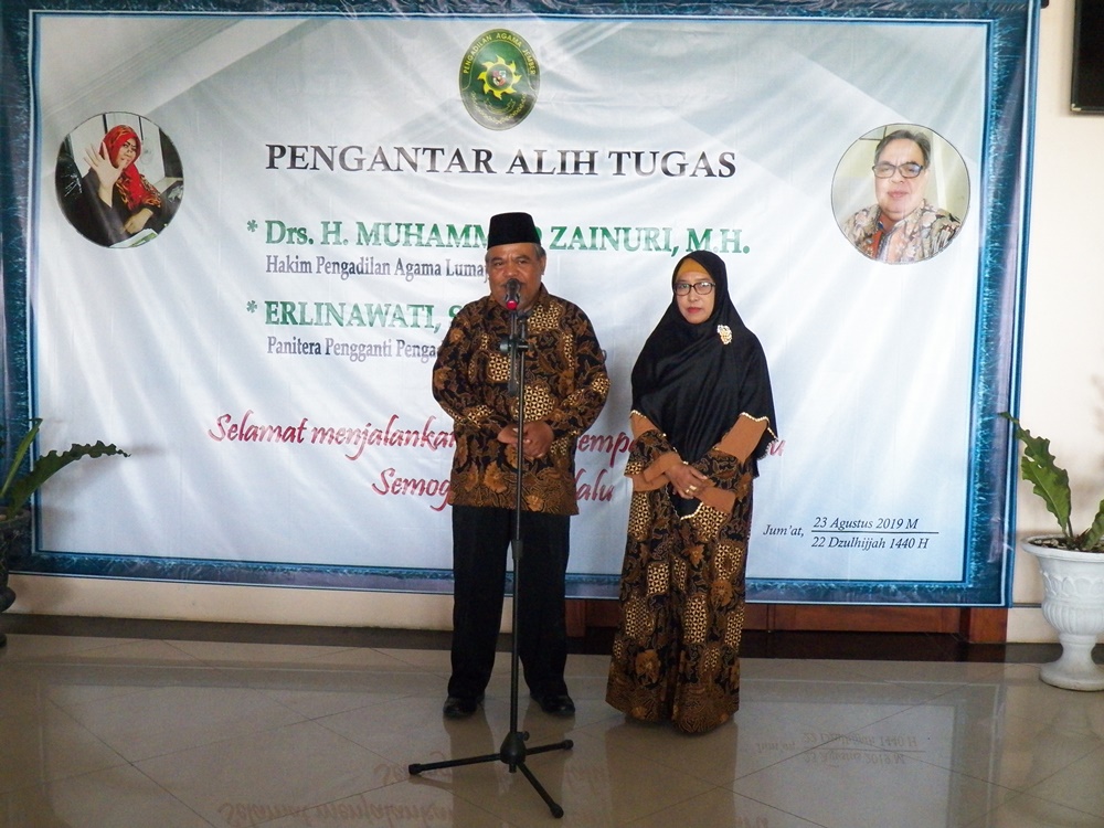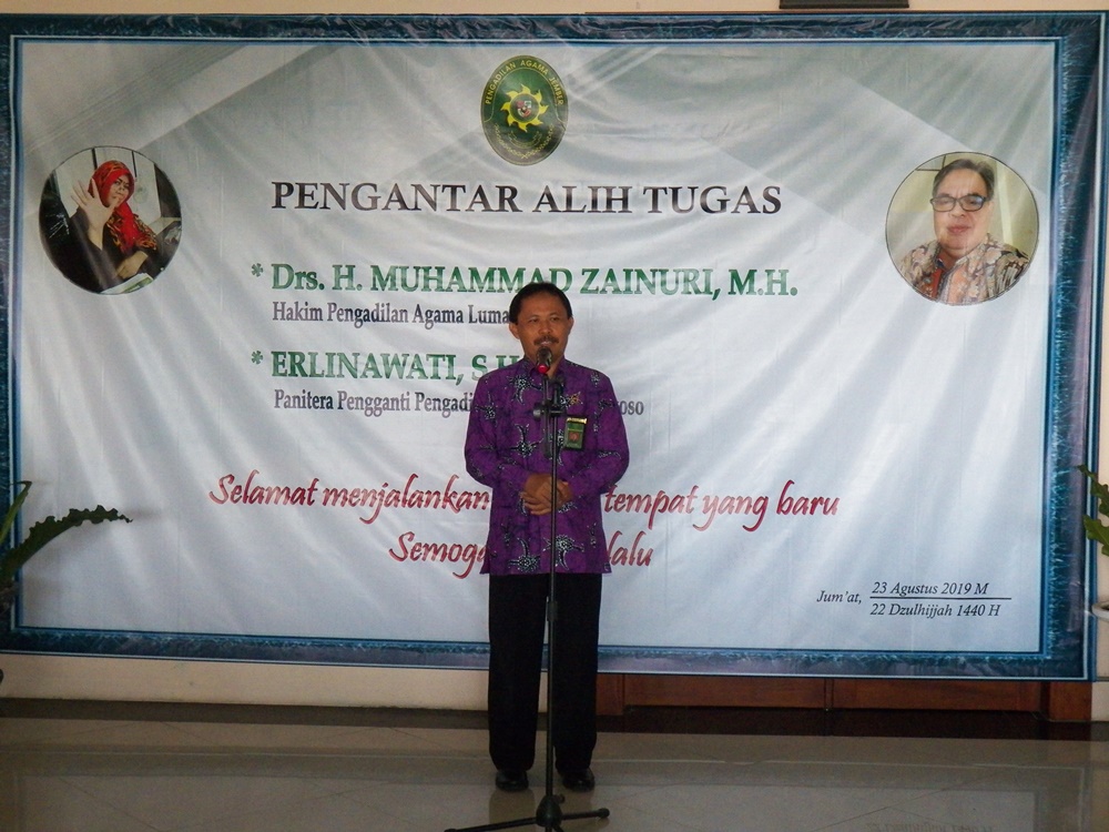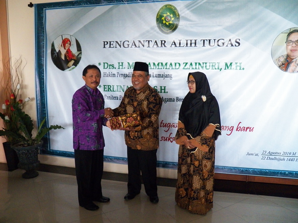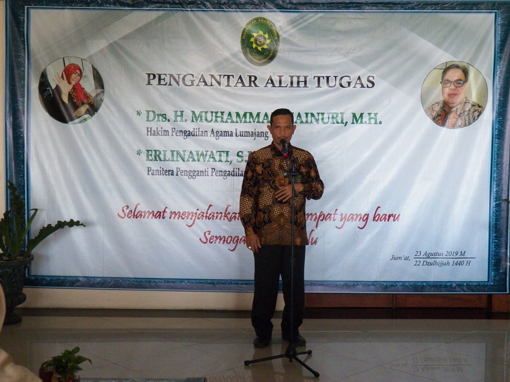 Pada hari Jum'at tanggal 23 Agustus 2019 pukul 09.00 WIB bertempat di Pengadilan Agama Jember diadakan acara pengantar alih tugas Hakim dan Panitera Pengganti Pengadilan Agama Jember yaitu Bapak Drs. H. M. Zainuri,MH yang pindah tugas sebagai Hakim di Pengadilan Agama Lumajang dan Ibu Erlinawati, S.H. sebagai Panitera Pengganti Pengadilan Agama Bondowoso.