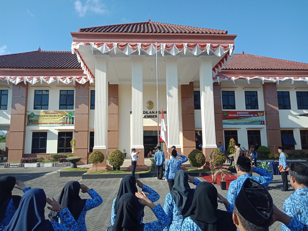Pada hari Sabtu, 17 Agustus 2019 Pukul 07.30 WIIB. bertempat di halaman Kantor Pengadilan Agama Jember dilangsungkan upacara memperingati hari ulang tahun kemerdekaan RI ke 74 dengan pembina upacara Ketua Pengadilan Agama Jember Drs. H. Moh. Khazin, M.H.E.S. dan dihadiri oleh seluruh Hakim dan Pegawai Pengadilan Agama Jember.