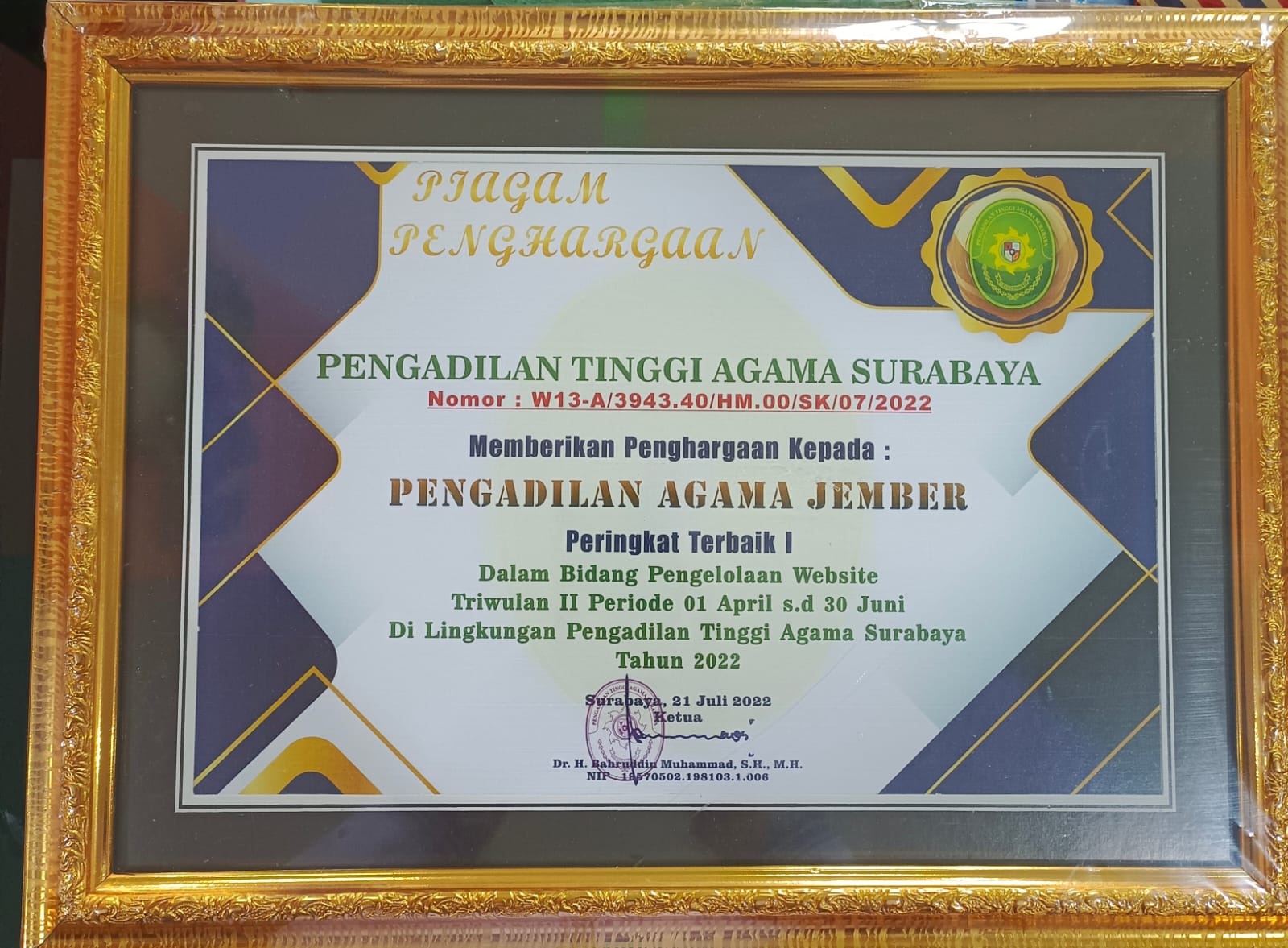 Peringkat Terbaik I dalam Bidang Pengelolaan Website, Triwulan II Di Lingkungan PTA Surabaya Tahun 2022 |