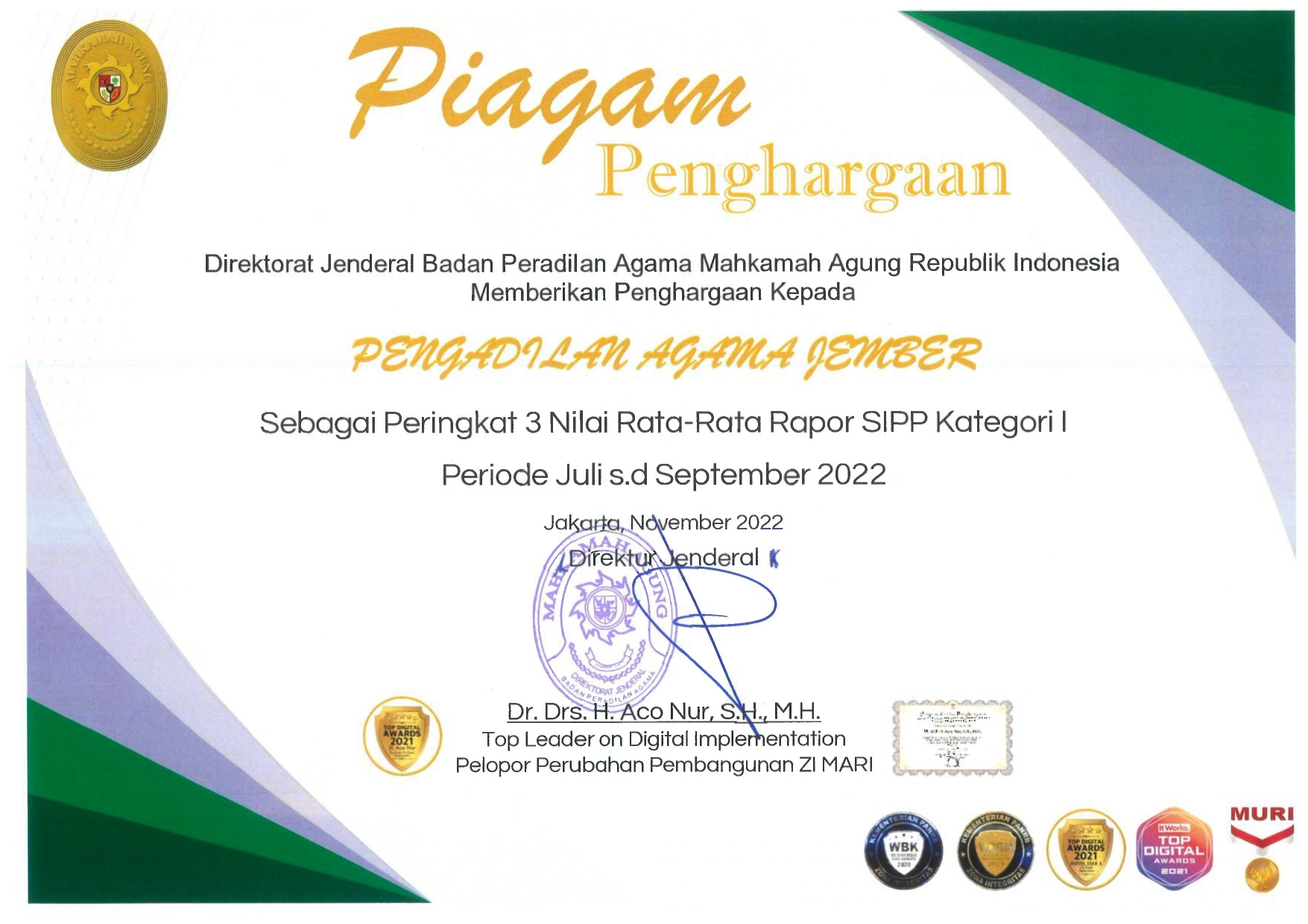 | Pemberi Penghargaan | : | Direktur Jenderal Badan Peradilan Agama | ||
