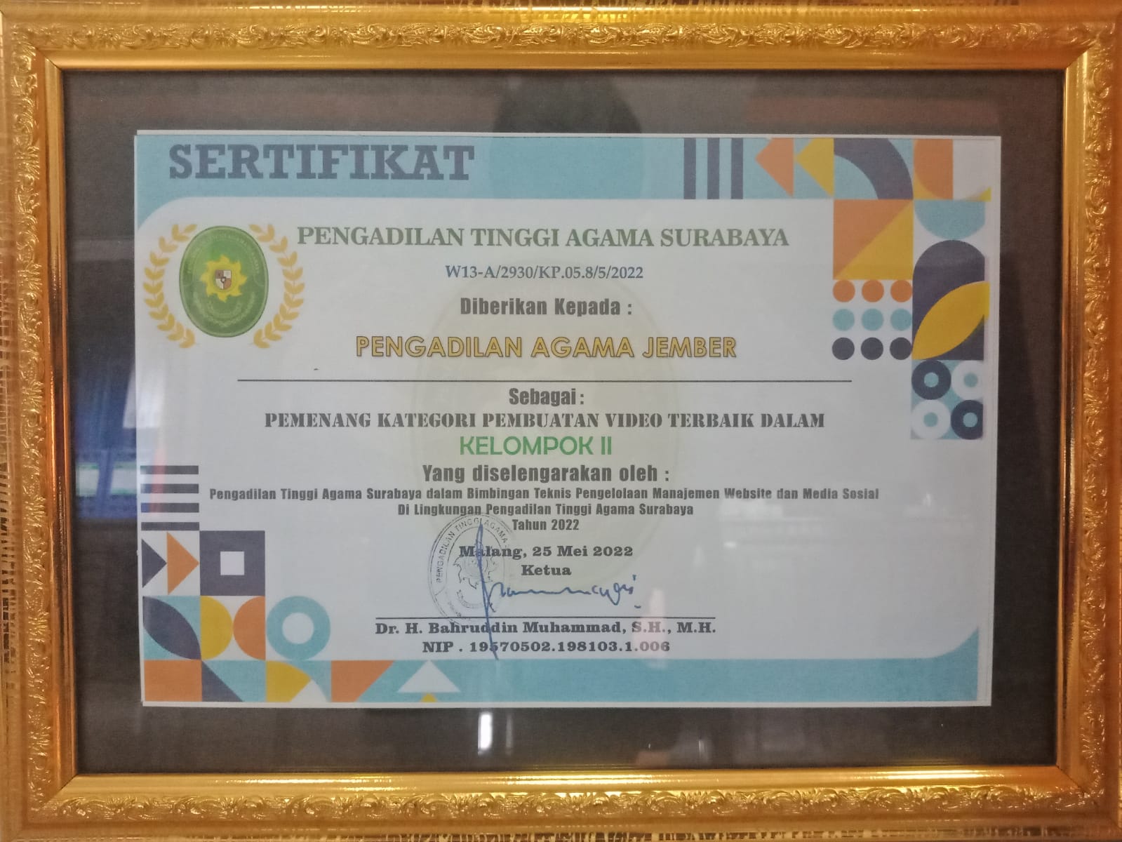Peringkat Terbaik dalam Bidang Kategori Pembuatan Video Terbaik dalam Kelompok II, dalam Bimbingan Teknis Pengelolaan Manajemen Website dan Media Sosial Di Lingkungan PTA Surabaya Tahun 2022 |