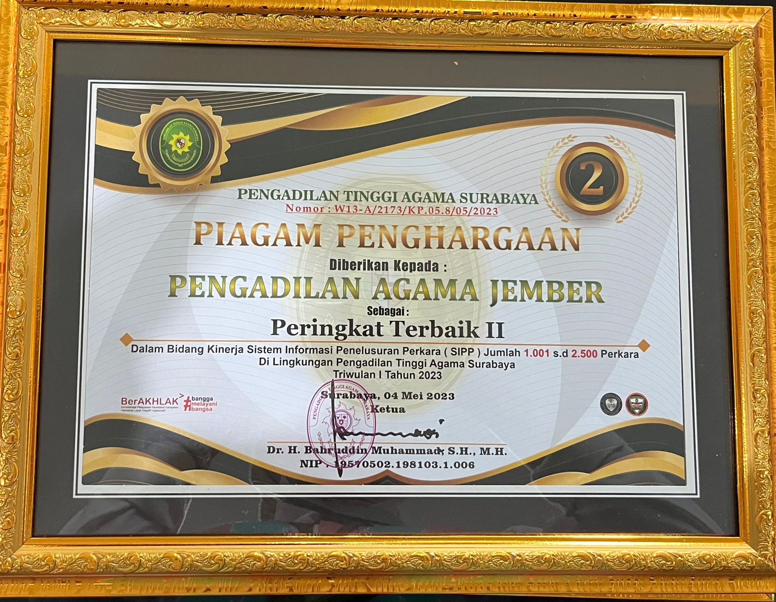 Peringkat Terbaik II dalam Bidang Kinerja Terbaik di Lingkungan PTA Surabaya Triwulan 1 2023 |