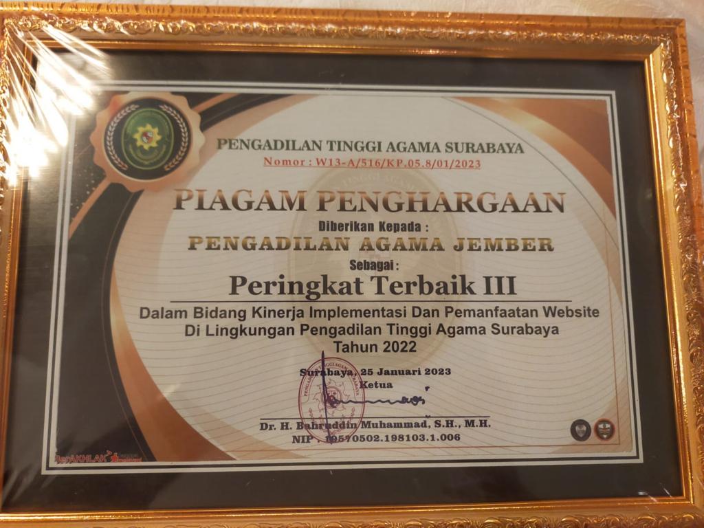 Peringkat Terbaik I dalam Bidang Kinerja Implementasi Pemanfaatan Website di Lingkungan PTA Surabaya Triwulan 1 2023 |